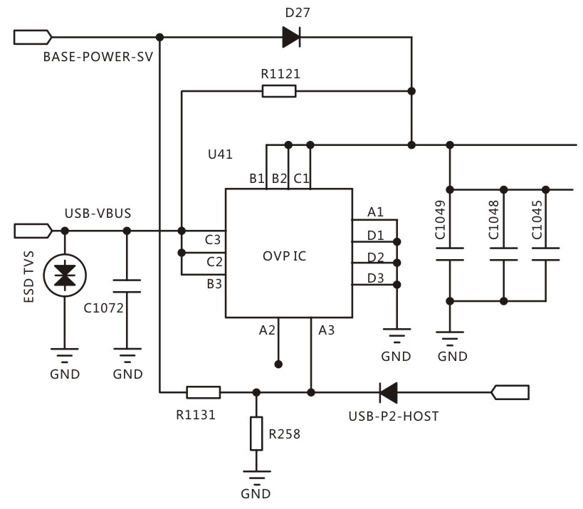 產(chǎn)品電路圖如下(原電路圖),該USB接口輸入端有三級(jí)防護(hù),初級(jí)是一個(gè)ESD類的防護(hù)器件,后級(jí)還有一個(gè)OVP防護(hù)器件,兩級(jí)之間沒(méi)有做退耦器件。查相關(guān)規(guī)格書(shū),OVP的通流較小,為5A。前級(jí)ESD通流相對(duì)較大點(diǎn),為100W,折算成8/20μs的電流,約為13A左右。