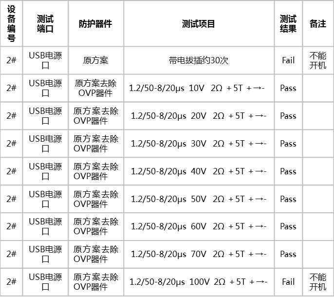 某客戶的智能手持式POS機(jī),使用的是USB口作為整機(jī)的電源輸入口,在使用過(guò)程中,經(jīng)過(guò)數(shù)次帶電拔插,設(shè)備就不能開(kāi)機(jī)了,電源輸入異常。拆機(jī),測(cè)量USB電源兩端為短路,查出為OVP芯片短路所致。由于去除了OVP器件,客戶擔(dān)心實(shí)際使用過(guò)程中會(huì)存在應(yīng)用風(fēng)險(xiǎn)。故,提出EOS滿足200V的測(cè)試要求。