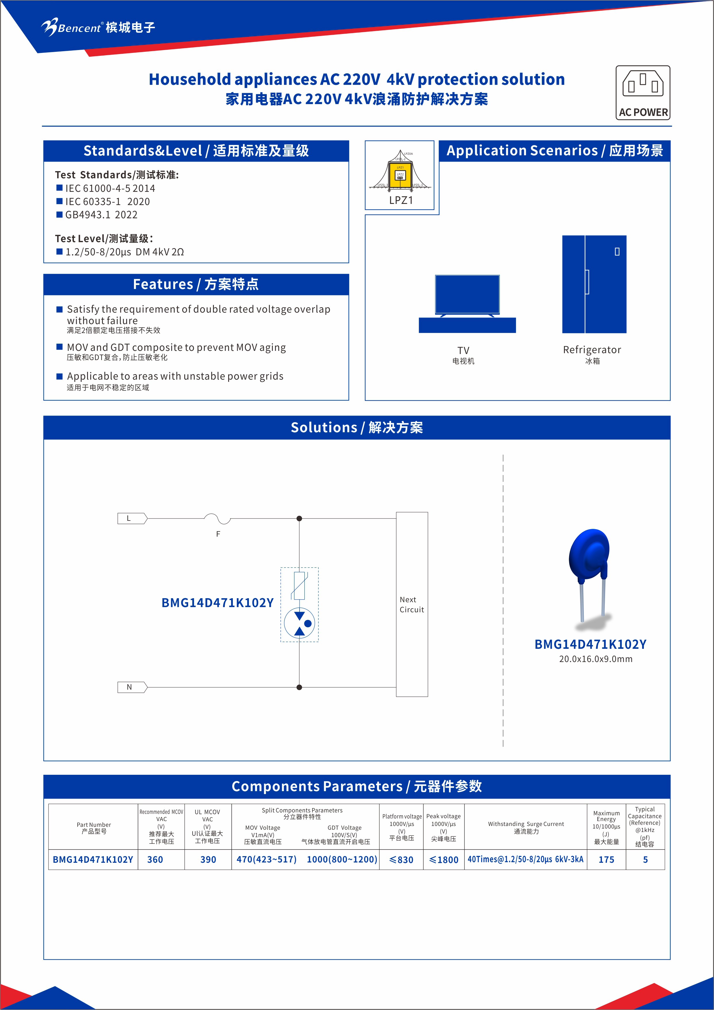 ? MOV復合GDT產(chǎn)品BMG系列——能夠有效調(diào)和新安規(guī)與浪涌保護之間的沖突,提供在同等Uc下,低箝位電壓的解決方案。