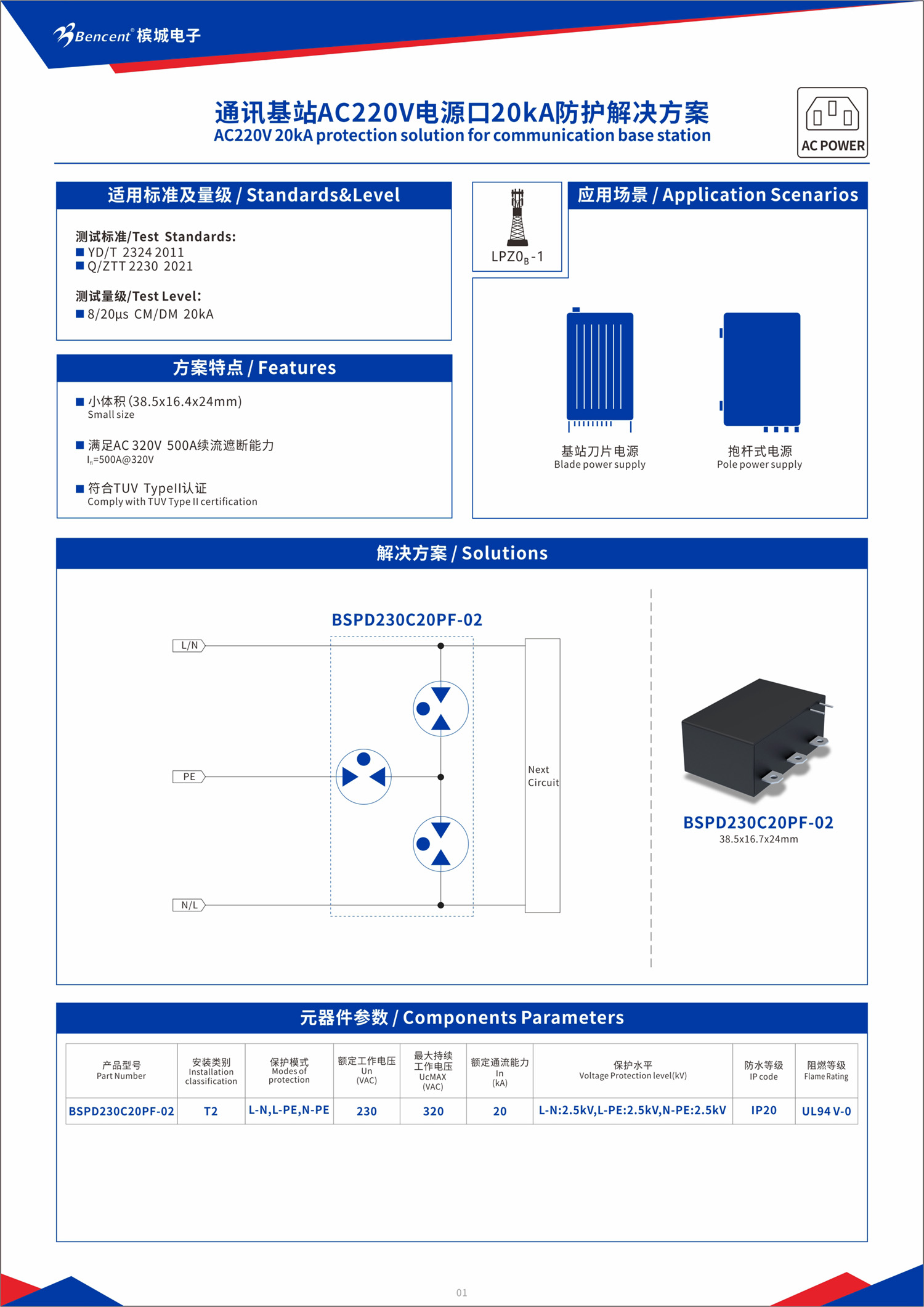 針對(duì)電網(wǎng)的異常干擾,我們提供了高通流密度的防雷模塊BSPD230C20PF02: